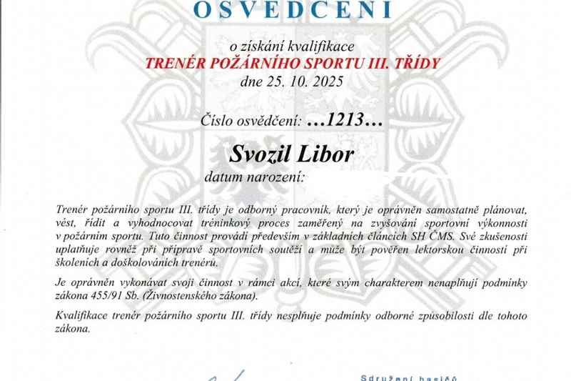 Libor Svozil úspěšně získal kvalifikaci trenér požárního sportu III. třídy. Miloslava Stanislavová obhájila kvalifikaci vedoucí mládeže II. stupně. Oběma gratulujeme a děkujeme za jejich činnost